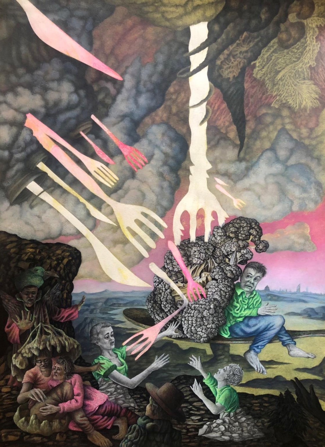 Unwetter nahe Leipzig | 2022 |ca. 50cm x 80cm | Grafit, Acryl, Tusche in versch. Farben, Buntstift und Faserstift auf Kupferdruckpapier
